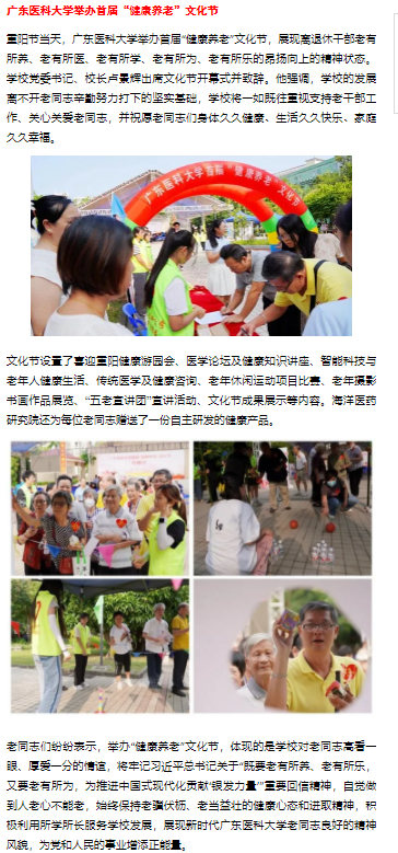 重阳佳节,广东医科大学首届“健康养老”文化节盛大启幕,成为校园内一道亮丽的风景线,展现出离退休干部们积极向上的精神风貌,受到广泛关注,南方 + 和广东老干部等媒体纷纷进行报道。